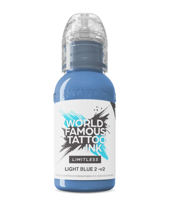 Limitless Light Blue 2 v2 to tusz z nowej linii tuszów w odcieniach błękitu i zieleni od World Famous Ink, zgodnej z najnowszymi przepisami unijnymi, rozporządzeniem REACH. Opracowanie nowej formuły było konieczne z uwagi na wprowadzony w życie od stycznia 2023 zakaz używania pigmentów Green 7 (zielony) i Blue 15 (niebieski).